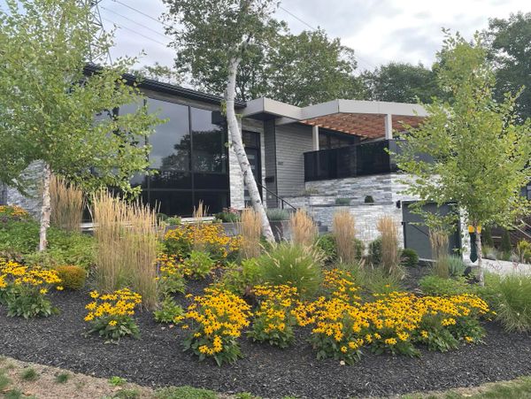 Description: Extensive planting, stepped walkway to building entrance, new driveway, outdoor living deck and hot tub, utilities screening.