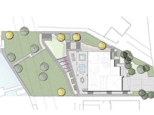Description: Outdoor living and pool terrace, natural playground, lawn and planting areas.