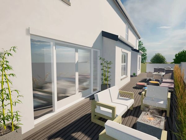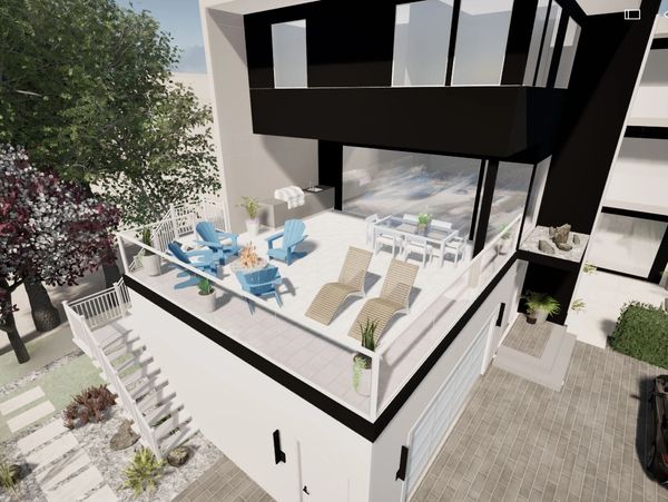 Description: Modern home with paver entrance & driveway, outdoor living terrace lawn, planting & outdoor living roof deck.