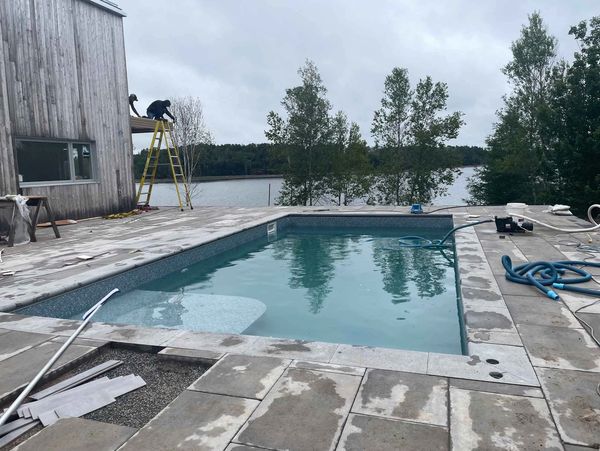 Description: Design of pool terrace with firepit area, retaining walls, planting.