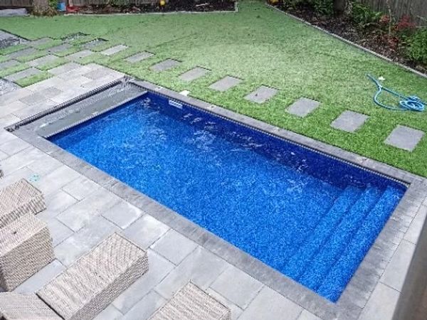 Description: New landscape for home reno with new driveway & parking areas, separate yard for basement unit, pool terrace, cabana, firepit terrace, outdoor living deck, lawn, planting.