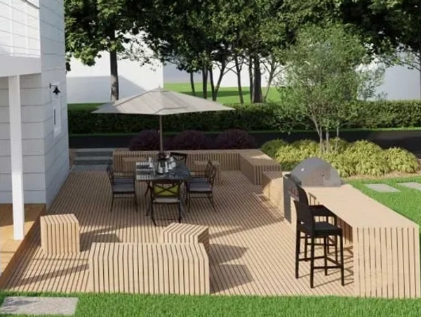 Description: Outdoor living area with bbq, bar seating, dining table, bench seating and block benches in same style as deck, planting beds.